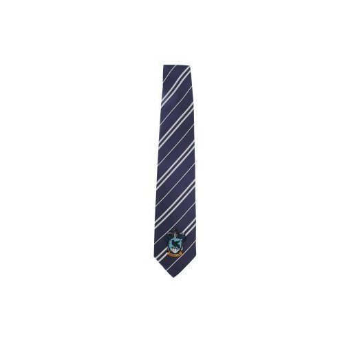 For dress or for play any one can wear this Ravenclaw house necktie from Harry Potter. This fine silk tie displays the Ravenclaw Coat of Arms and is a dark blue with silver diagonal stripes. The tie is the length of average neckties, approximately 56 inches long and 4 inches wide at the bottom